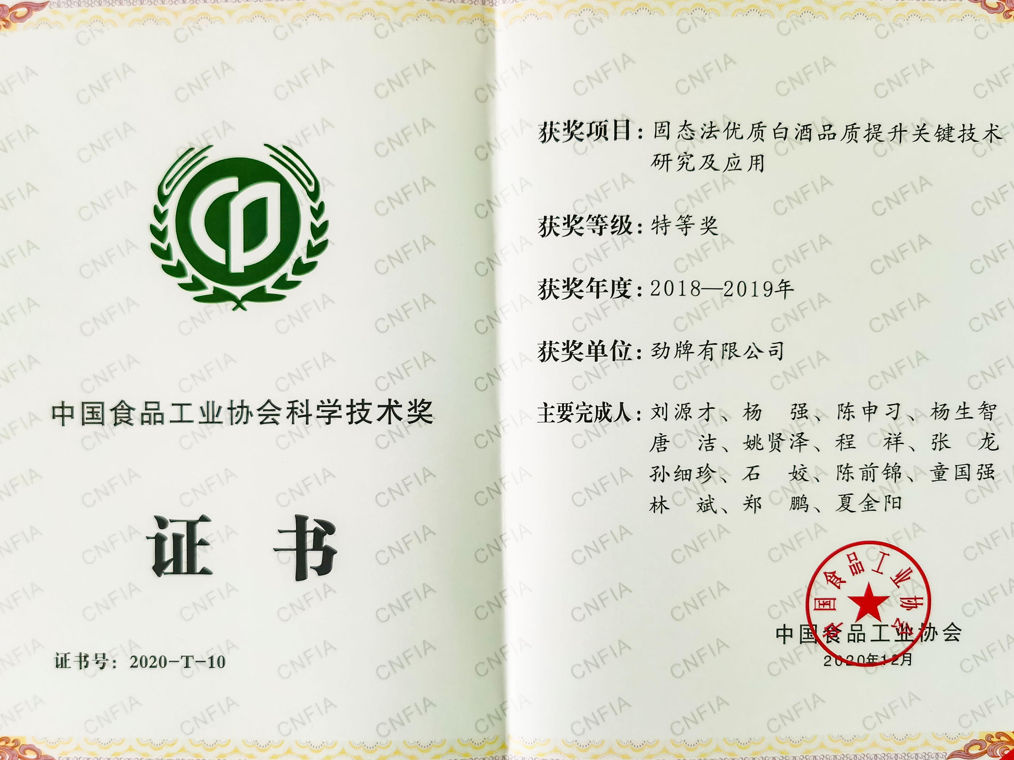 12月6日,2020第四屆中國食品產(chǎn)業(yè)發(fā)展年會(huì)暨華糖萬商大會(huì)全會(huì)在河南鄭州開幕。大會(huì)頒發(fā)了2020年度“中國食品工業(yè)協(xié)會(huì)科學(xué)技術(shù)獎(jiǎng)”,勁牌公司《固態(tài)法優(yōu)質(zhì)白酒品質(zhì)提升關(guān)鍵技術(shù)研究及應(yīng)用》項(xiàng)目榮獲特等獎(jiǎng)。