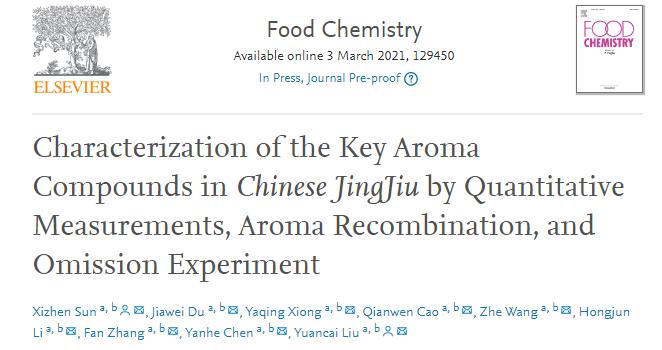 近日,國際學(xué)術(shù)期刊食品化學(xué)(Food chemistry,中科院1區(qū),影響因子為6.306)在線發(fā)表了《通過定量分析,香氣重組和缺失實(shí)驗(yàn)表征中國勁酒中的關(guān)鍵香氣活性化合物》的研究文章。撰稿人正是來自勁牌研究院的風(fēng)味研究小組。