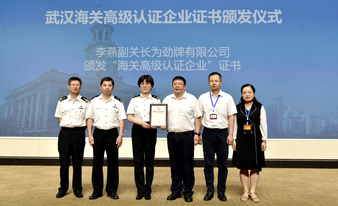 公司國際事業部自2022年1月牽頭啟動海關AEO認證工作,對標認證要求的五大類十八條32項標準,進行資料收集、整理和完善,于2022年5月24日正式提交認證申請,經過海關資料審核,現場認證審核及問題整改,最終在7月15日完成認證評定。勁牌公司為黃石海關轄區首家食品類海關高級認證企業。